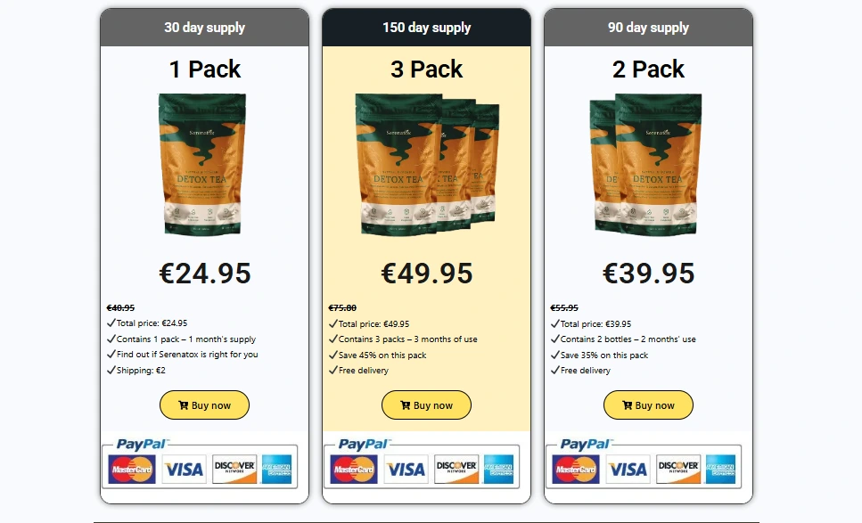 Serenatox Detox Tea UK me multiple value packs ke saath available hai, jisse buyers apni need aur budget ke according choose kar sakte hain.